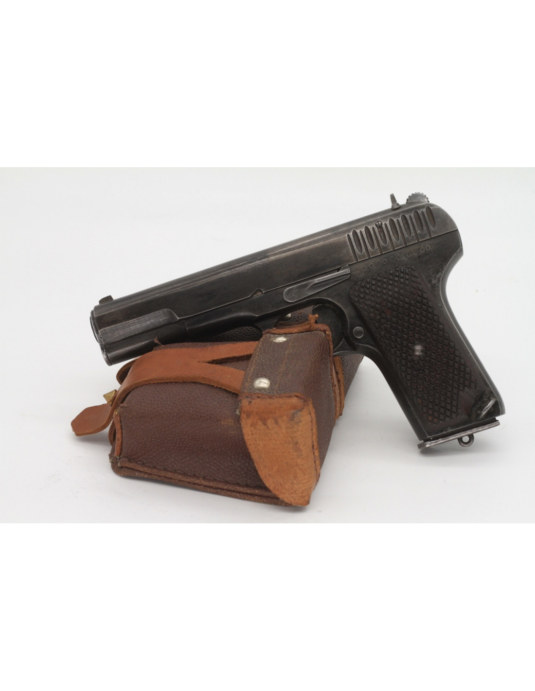 Le Tokarev TT-33, chambré en 7,62x25mm, est l’un des pistolets militaires les plus emblématiques de la Seconde Guerre mondiale. Conçu par Fedor Tokarev, il fut adopté par l’Armée Rouge en 1933 pour remplacer les anciens revolvers Nagant M1895. Ce modèle daté de 1944 est un véritable morceau d’histoire, ayant équipé les troupes soviétiques sur le front de l'Est.