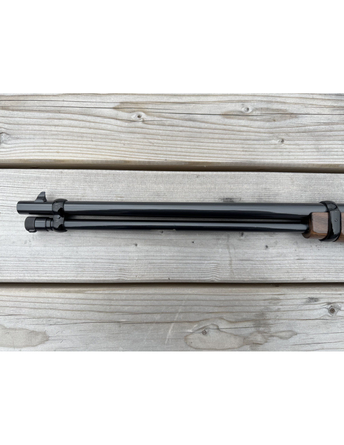Superbe carabine à levier Browning BL-22 d'occasion en calibre .22LR, capacité 9+1 coups. Arme en excellent état, proche du neuf, très peu utilisée. Canon parfait, intérieur miroir, bronzage impeccable sans aucune oxydation. Mécanique fluide et précise. Bois verni présentant seulement quelques légères marques superficielles dues au stockage en armoire forte.
