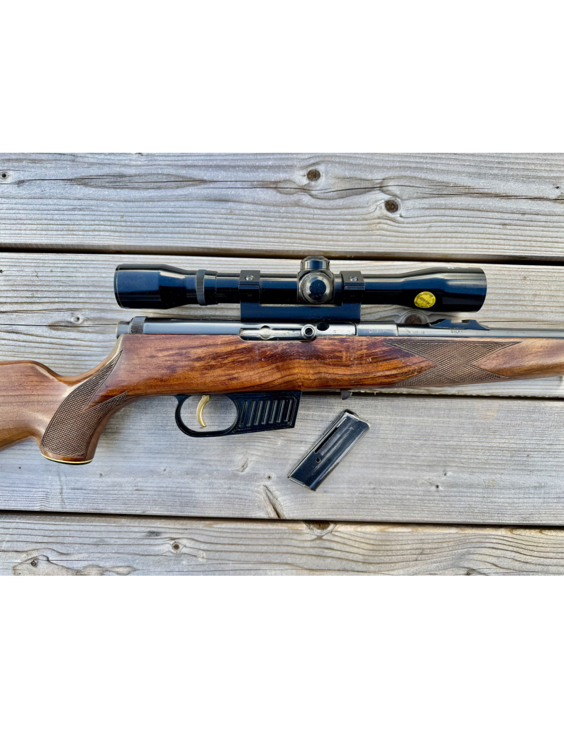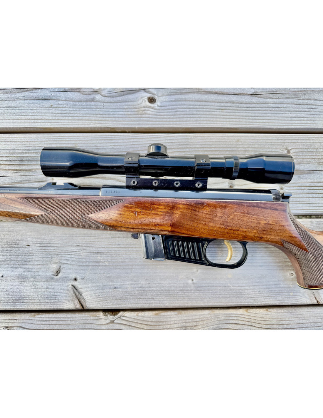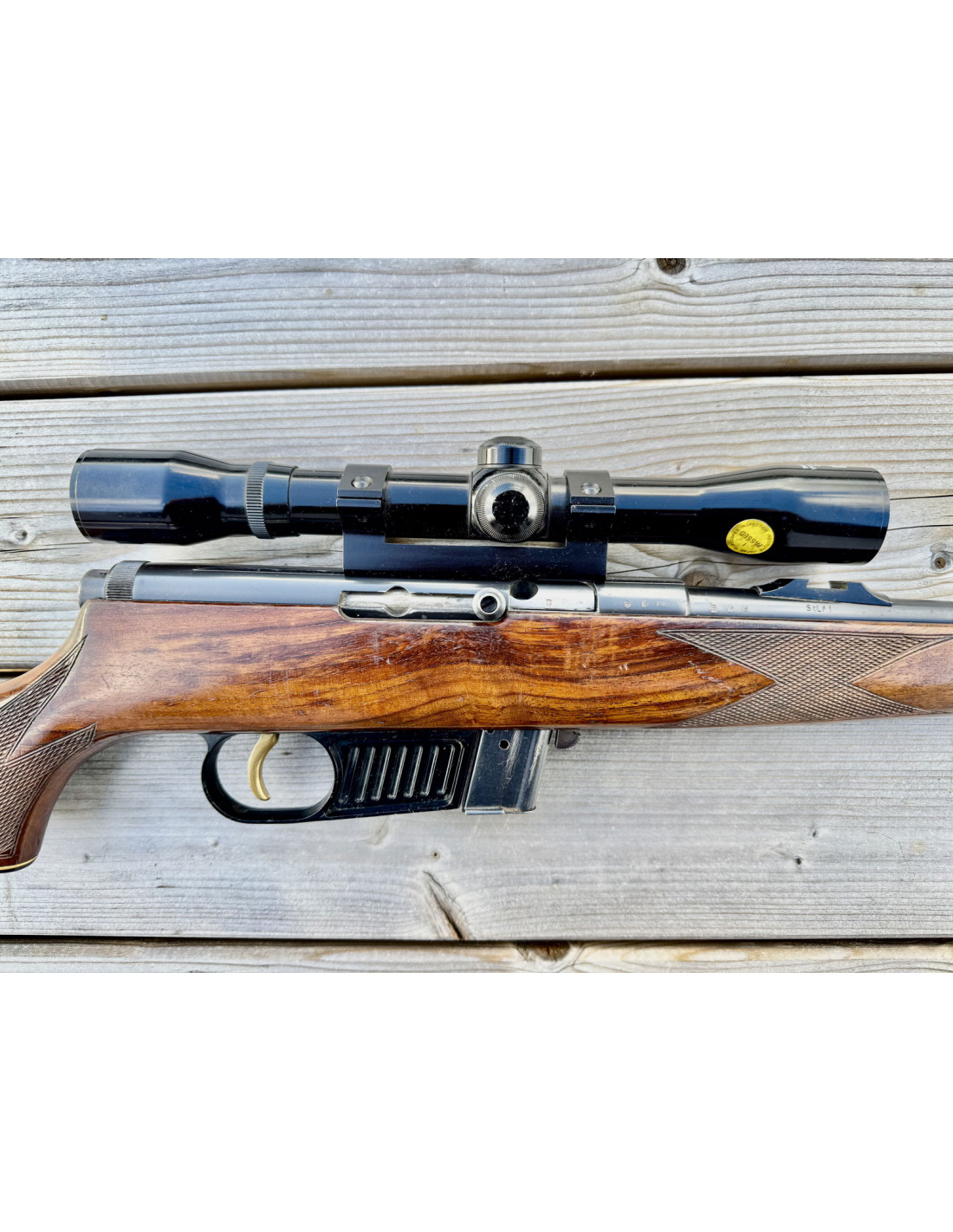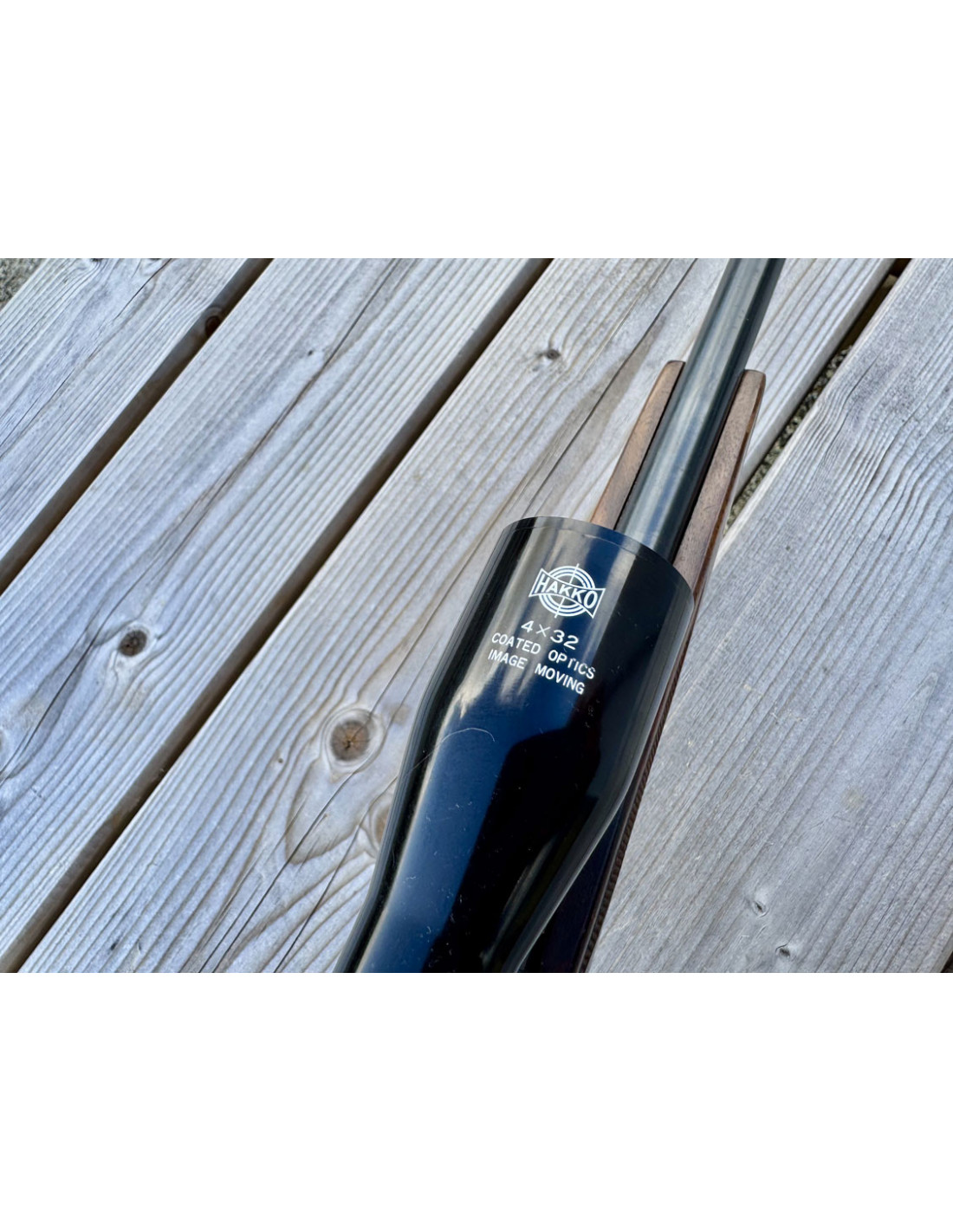 Avec lunette d'époque (année 70-80) HAKKO 4X32mm réticule à chevron, monté sur rail 11mm.