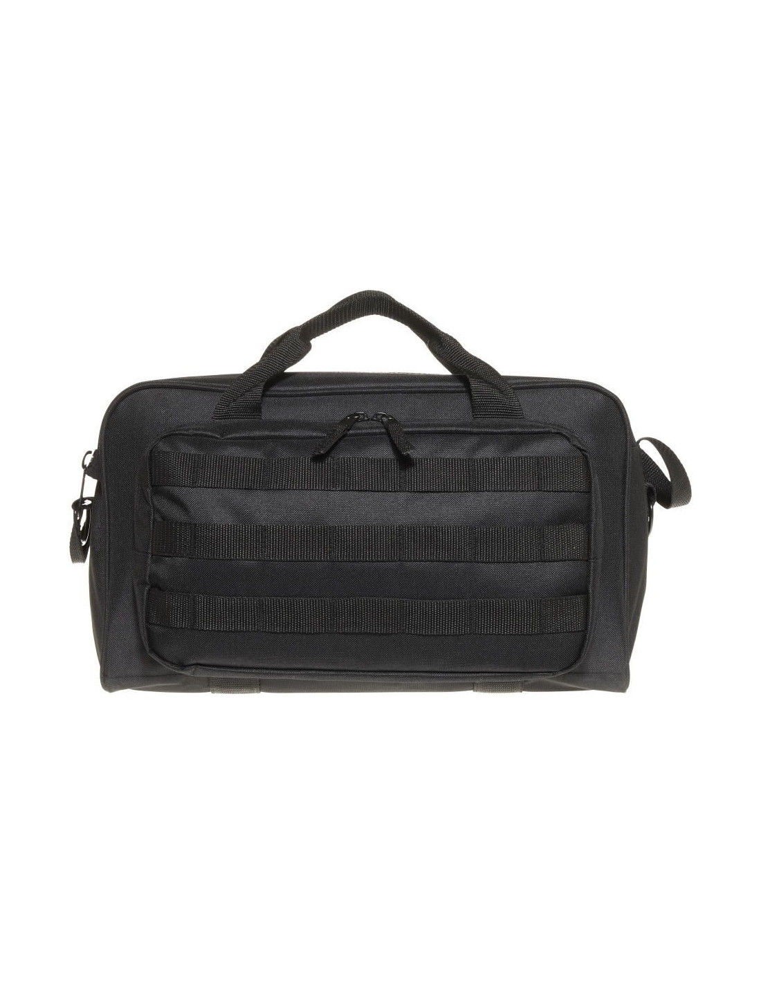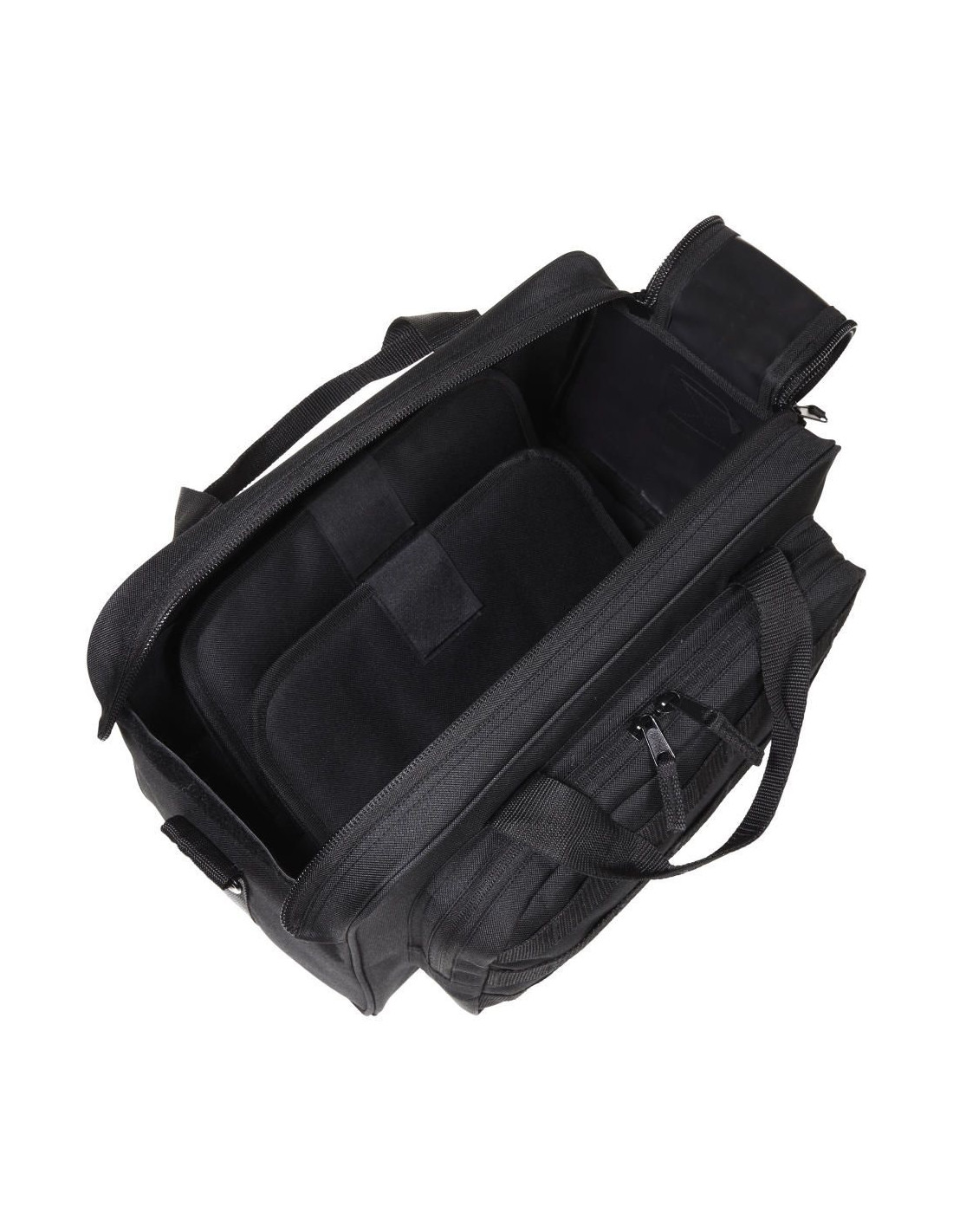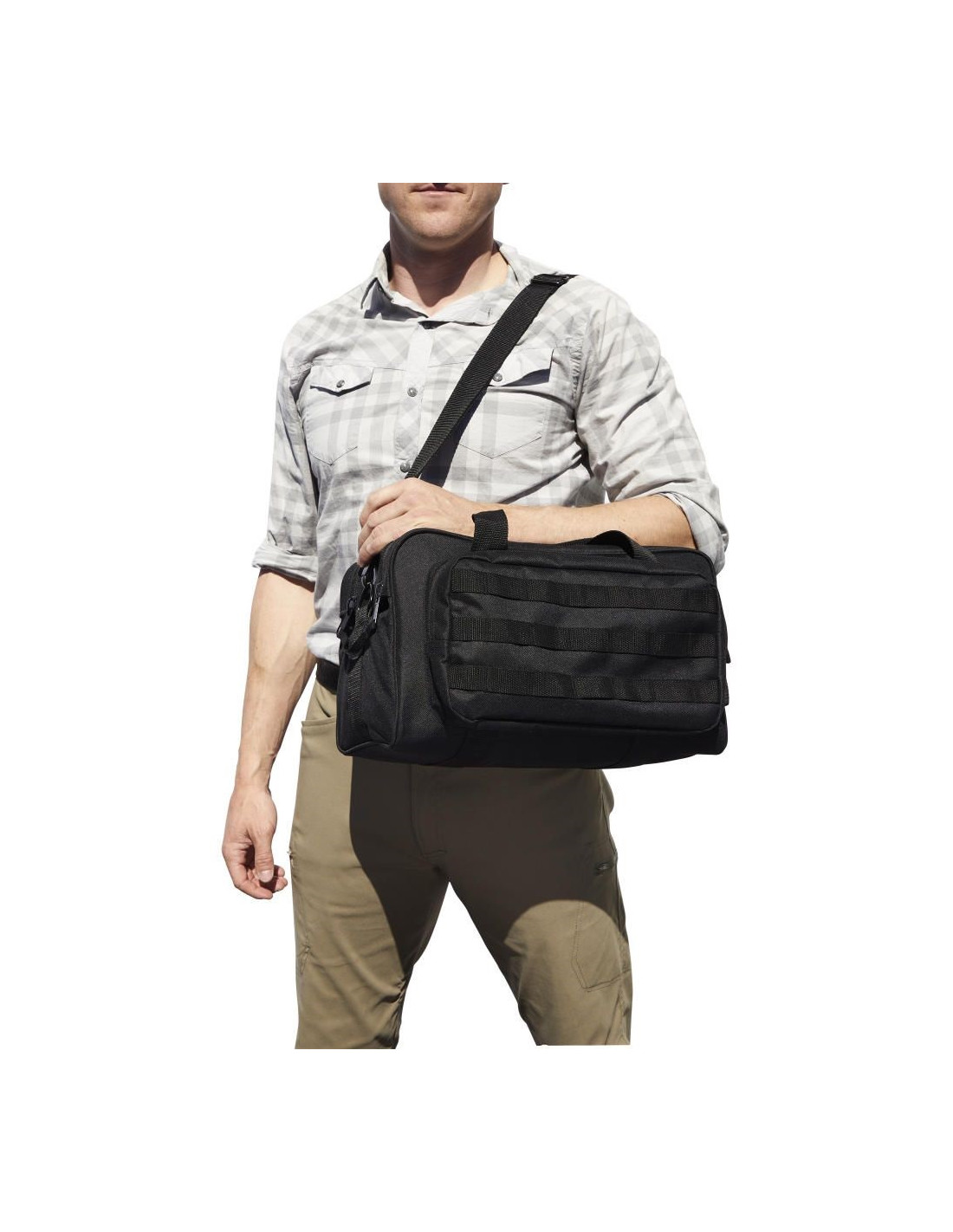 Ce sac de tir noir classique, idéal pour le transport au stand de tir de 2 armes de poing, les chargeurs, munitions et un casque anti-bruit : comporte un compartiment principal de 38 cm x 20 cm x 21,5 cm et une poche extérieure de 30 cm x 15 cm x 2,5 cm ainsi que trois rangées de boucles MOLLE.