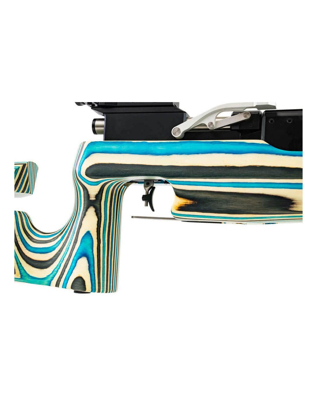 Le bois laminé de la crosse est réglable de multiples façons : la plaque de couche peut être inclinée, élevée, abaissée ou reculée jusqu’à 2 cm, l’appui-joue peut être élevé jusqu’à 4 cm, et la crosse est ambidextre avec levier de culasse réversible.