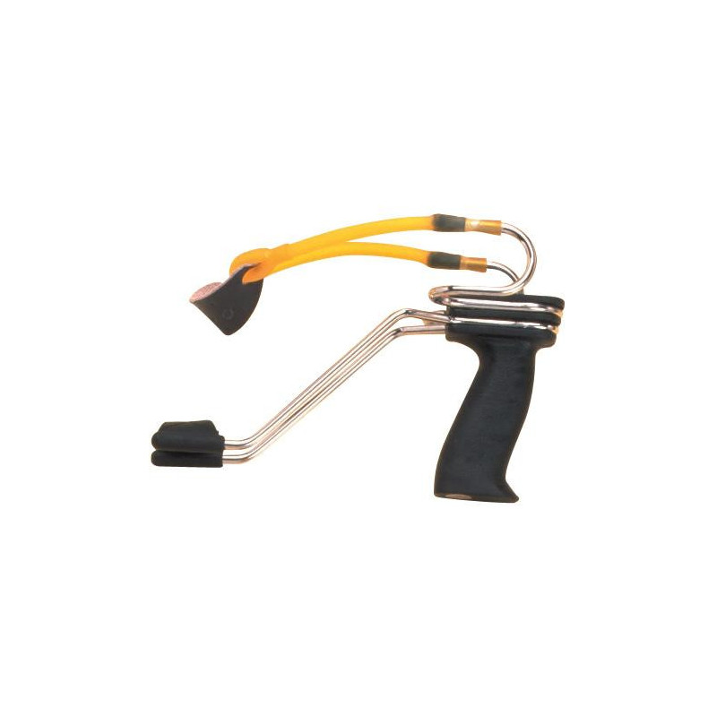 Lance-pierre métal, poignée plastique avec appui sur le poignet, nacelle cuir et élastique tubulaire.