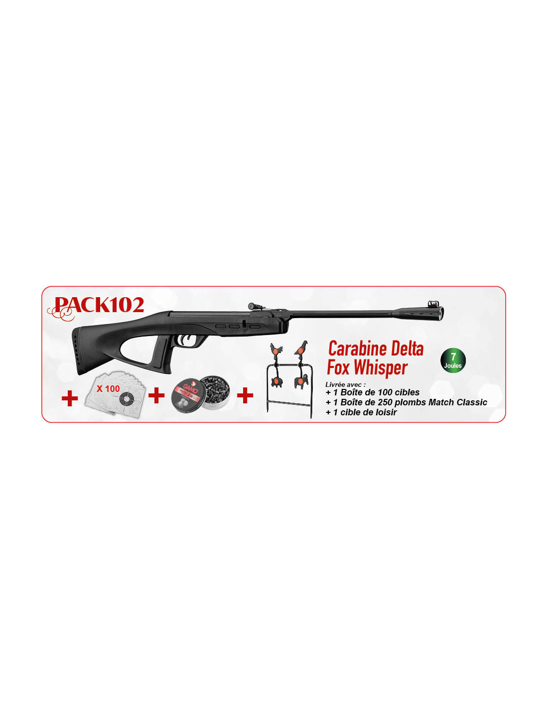 Le pack comprend également une boîte de 250 plombs Match Classic au profil plat, parfaits pour réaliser des tirs nets sur cible. Leur légèreté favorise des groupements précis, essentiels pour progresser en toute confiance. Les 100 cibles cartonnées 14 x 14 cm fournies permettent d’enchaîner les séries d’entraînement ou d’organiser des mini-compétitions entre amis ou en famille.